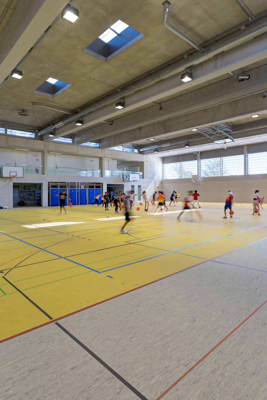 The programming of the German School Madrid includes a kindergarten, a primary and secondary school, a canteen, an auditorium and a gymnasium. The individual buildings are connected by courtyards, which are partly covered to provide shaded lounge areas for breaks.