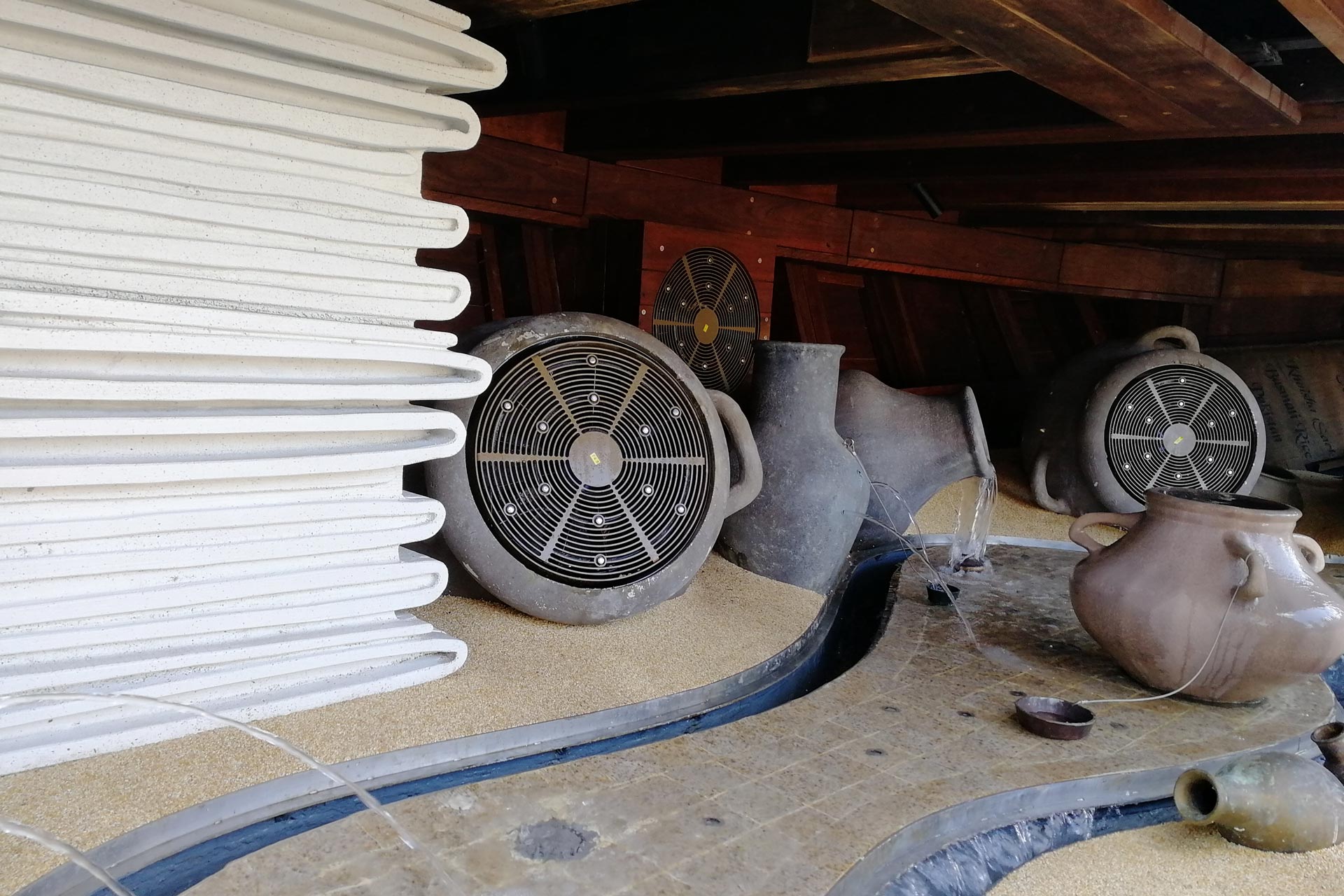 In addition, a technology developed by Transsolar, which we call 'Dry Mist', improves comfort “on board” by evaporative cooling. The necessary ventilators, the 'Dry Mist Fans', are built into custom-made elements such as clay pots or cargo boxes as well as the hull of the ship and are integrated into the architectural concept.