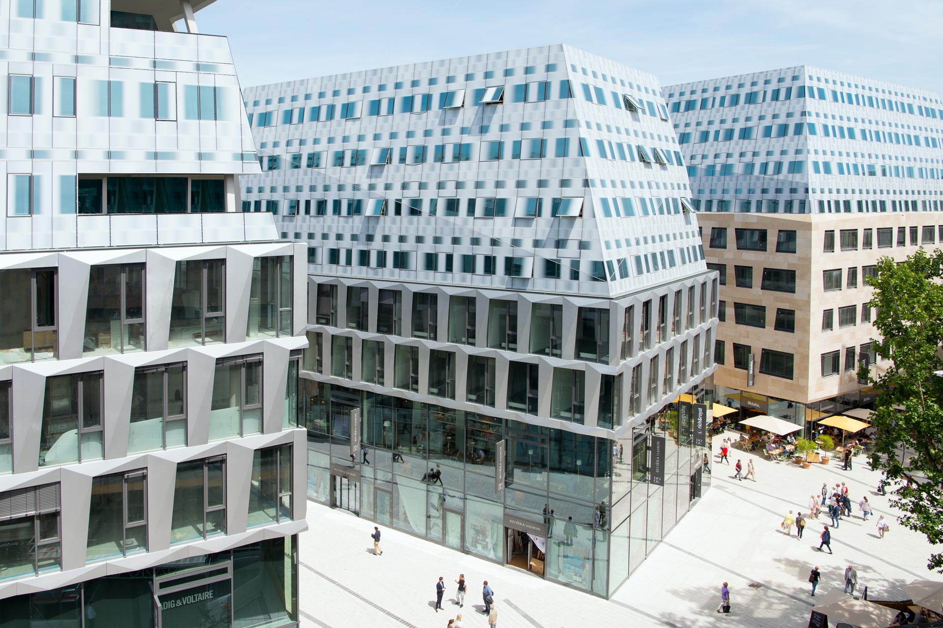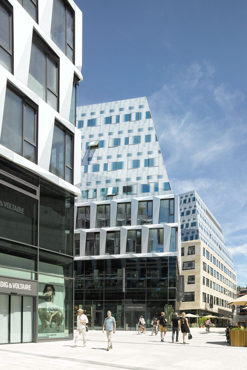 The aim was to create a lively inner city area with attractive, high-quality fronts on all sides. The scale, form and design of the three new buildings fit seamlessly into the existing, urban structure of the city. To do so, the geometries, axes and references to the surrounding squares played an important role.