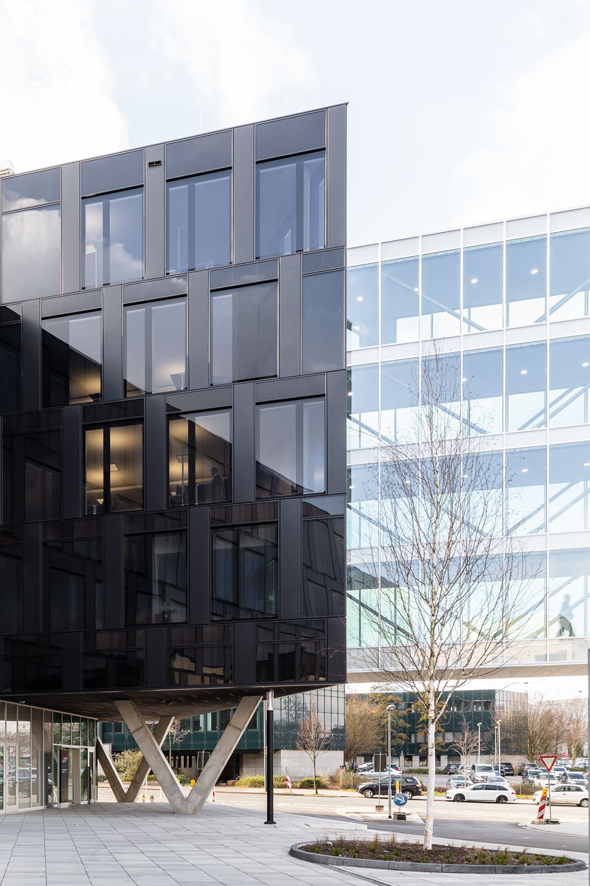Transsolar developed the energy and climate concept and tested its performance for thermal comfort and energy efficiency. The dark facade symbolizes printing ink and thus the newspaper. The idea makes sense from an energy standpoint, because with the "sunglasses" the sun protection closes late and daylight is allowed into the rooms longer. The employees have the advantage of a clear view for a longer period of time. The slats in the space between the panes provide daylight control and are controlled by radiation and temperature.