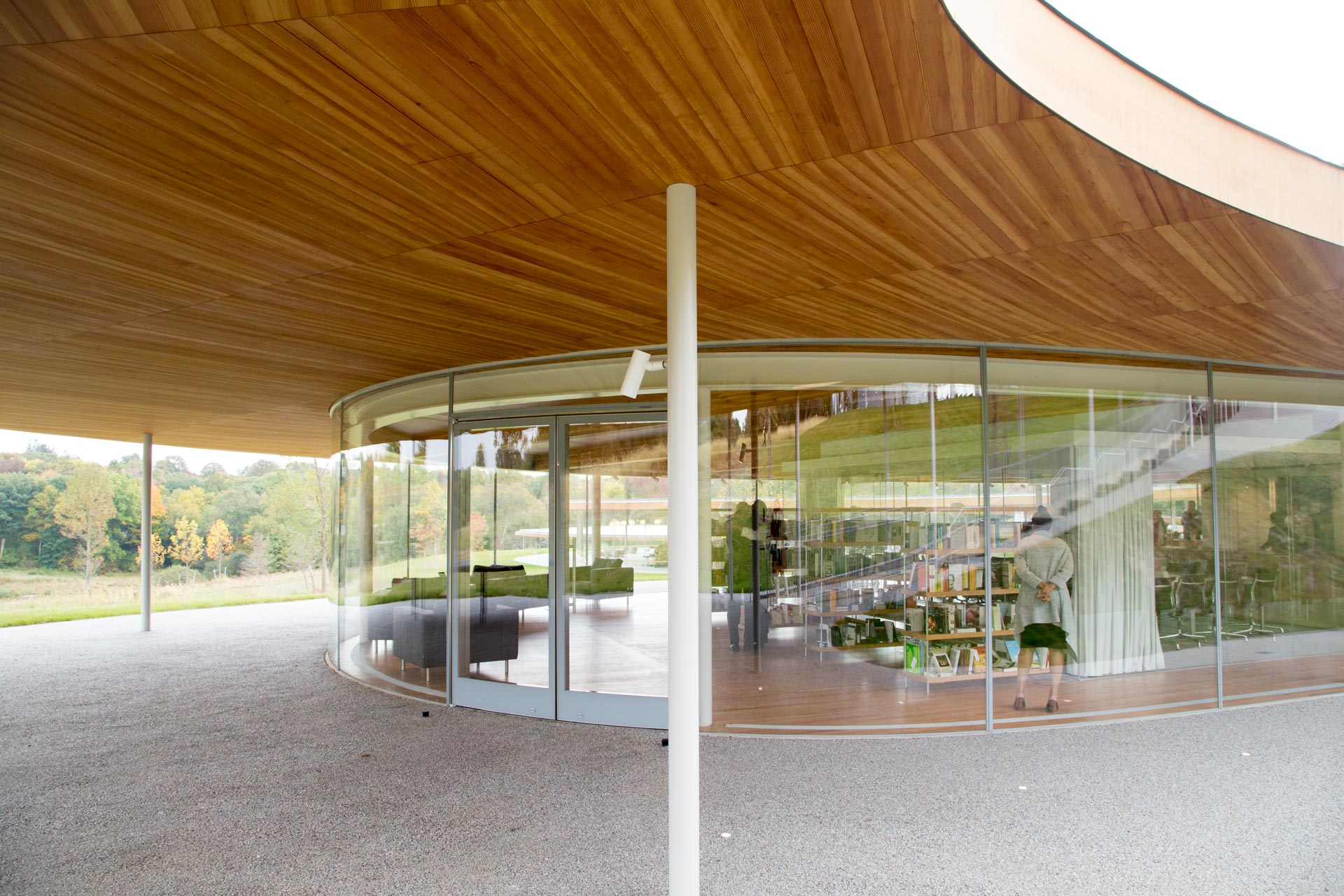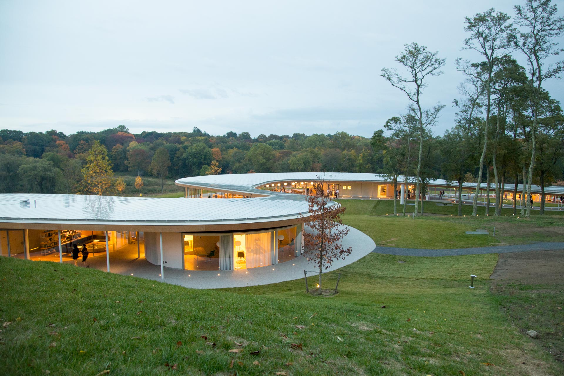 Nestled amid 75 acres of meadows, woods, wetlands and lakes, the River building begins on a knoll and meanders down in a series of bends, forming pond-like spaces. The building of glass, concrete, steel and wood possesses a single long roof, which appears to float above the ground as it twists and turns across the landscape. The walkways, courtyards and volumes wrapped in glass that form beneath the roof are remarkably transparent, inviting people to engage with the expansive natural surroundings which are being preserved by the not-for-profit Grace Farms Foundation.