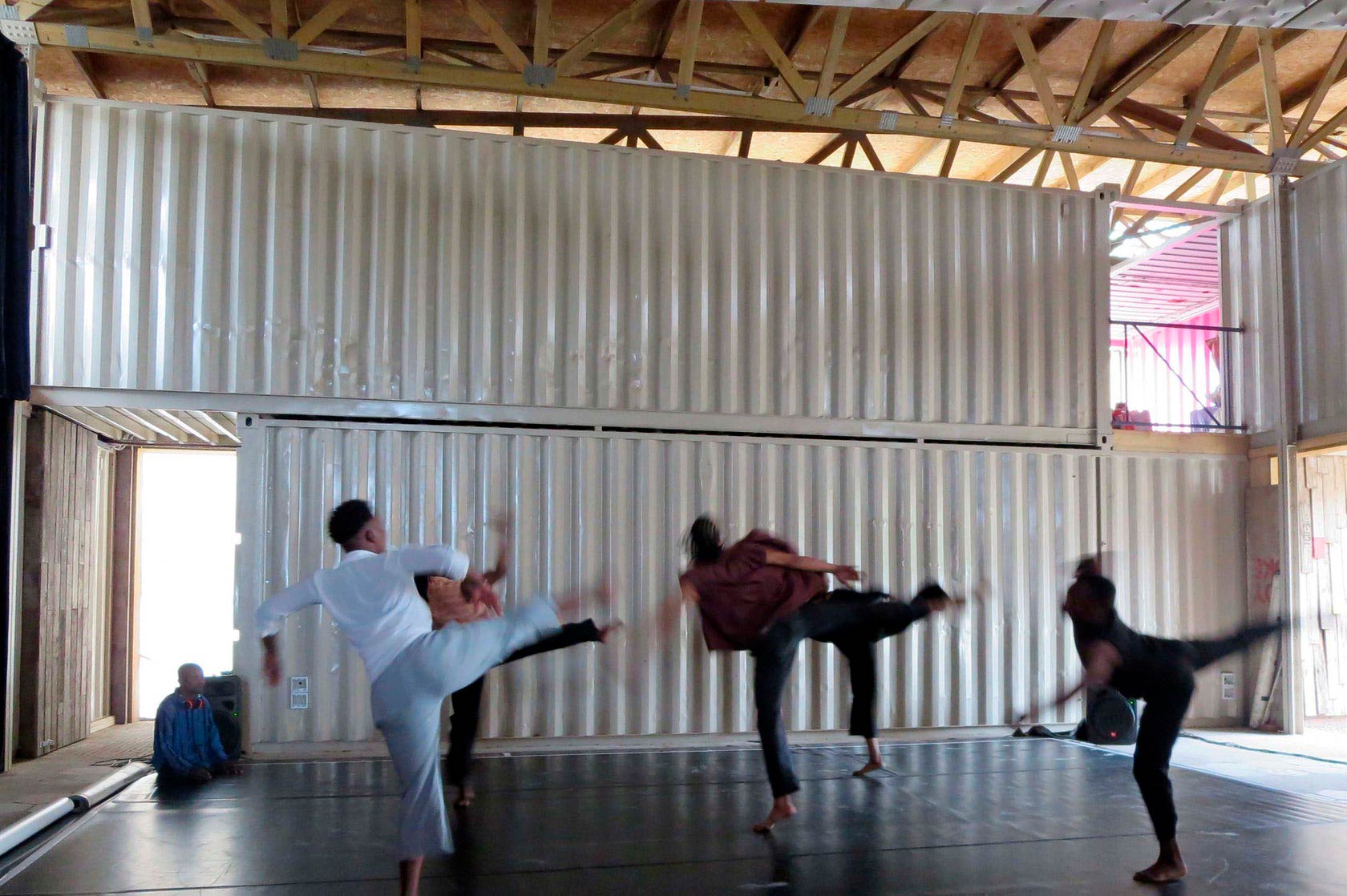 The Art and Culture Center Guga S'Thebe was built in Langa, Cape Town in 2006 as part of an initiative of RWTH Aachen. However, the center lacked a performance and concert space and so the decision was made to build the Guga S'Thebe Children's Theater nearby. Numerous institutions participated in the design, planning, and execution of the project in addition to RWTH including the Peter Behrens School of Arts in Dusseldorf and the Georgia Institute of Technology in Atlanta. The goal was a multifunctional space for up to 200 people and built primarily of local, traditional and recycled materials, including shipping containers, which were available at low cost.