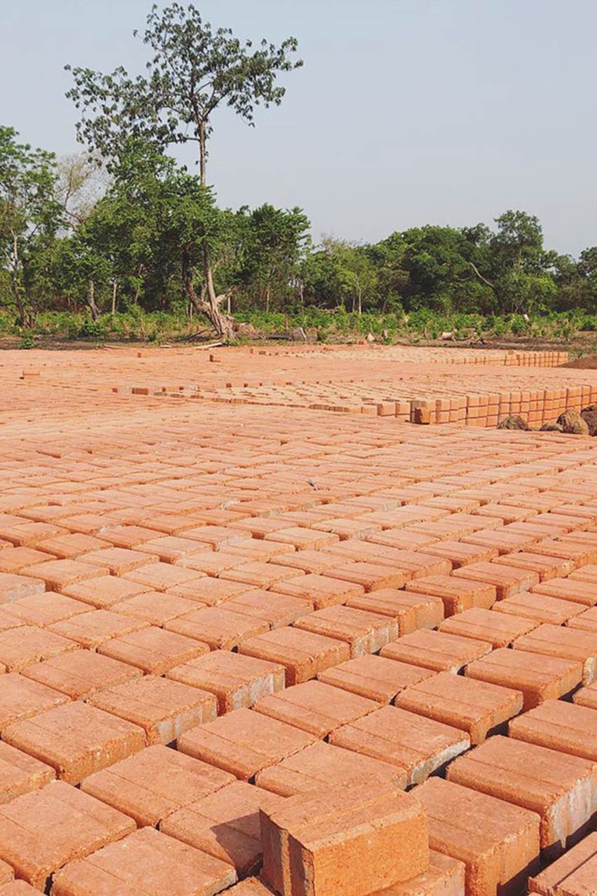Sturdy earth-cement blocks, which are produced in-house and processed without mortar, form the masonry, concrete bases protect them from monsoon rains.