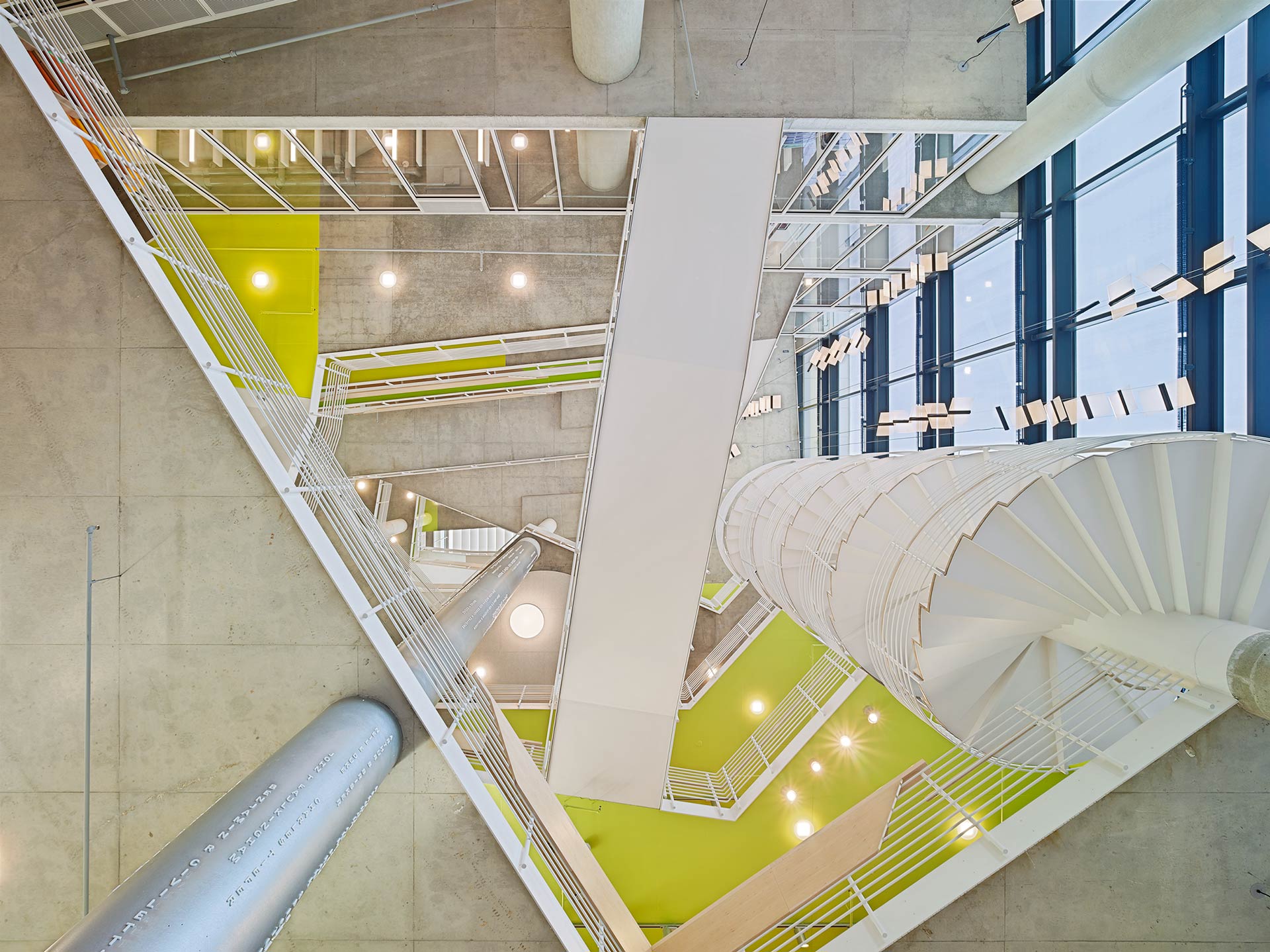 In order to prevent harsh lighting contrasts, the direct zenithal sunlight was reduced by installing a small skylight at the top of the atrium. Instead of using vertical daylight, the massing was developed in order to utilize horizontal daylight through the south and north facing facades. The floor sections, centered around the atrium, were optimized individually for maximum sky exposure and for softer horizontal light to travel deep into the floor plate. Daylight simulations were performed to fine tune and verify this approach and ensured the ongoing integration in the design.