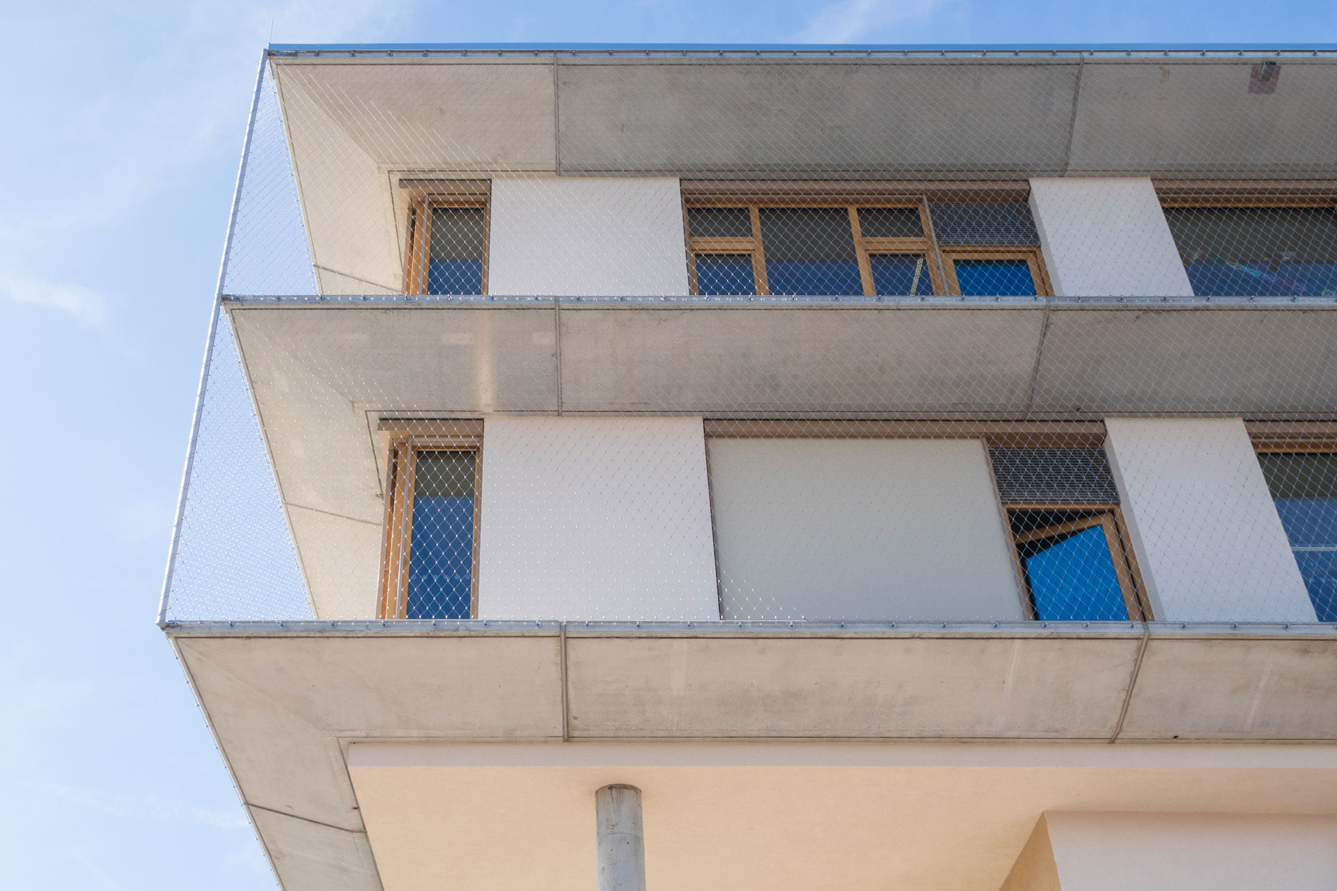 Administration, library and a wood workshop are located on the ground floor. The cafeteria can also be used for events, and the theater of the daycare facility can be included and used as a stage. There are science classrooms, an art room with a roof terrace, a secondary school learning house as well as additional dedicated classrooms. The daycare is located on the ground and first floors of the second construction phase. The escape balconies also serve as integrated shading. At the same time, they reduce the expenditure for maintenance and care of the façade.