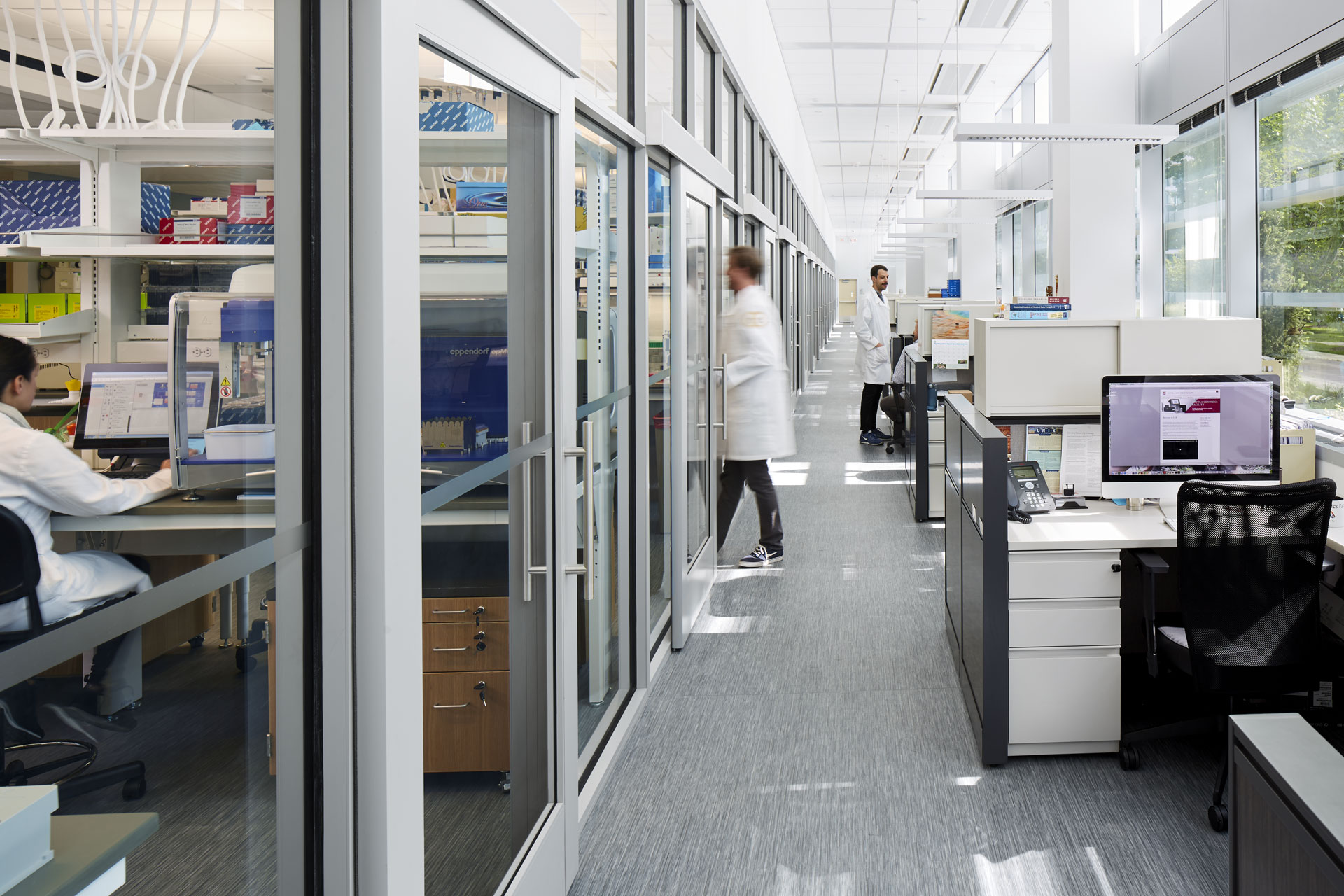 Transsolar developed the energy-efficient occupant-centric comfort concepts, ensured successful architectural integration of the overall concept, and performed daylight and advanced thermal simulations to tune comfort performance of the proposed architectural and low-energy mechanical climate control systems. Laboratory spaces with stringent climate control requirements are surrounded by spaces with relaxed climatic requirements - such as office and collaboration spaces - which are more capable of interacting with the exterior environment. This way all building occupants are able to control their relationship with the exterior - and thus their personal comfort - to the greatest extent possible. Floor plans and façade are tuned to allow daylight into nearly all regularly occupied spaces while solar heat gain is controlled. Detailed engineering studies helped develop an architecturally integrated natural cross-ventilation strategy for the offices, collaboration atrium, and auditorium by connecting the air flow path from façade openings to the atrium exhaust. Multiple strategies help minimize energy use of the laboratories: air cascade from separated write-up spaces, demand-responsive ventilation rates, runaround heat recovery, and local chilled beams for cooling. Transsolar also developed the conceptual design of the energy supply and recovery system, and coordinated detailed load and energy calculations with the MEP engineers to ensure that the energy performance expectations were consistent between all team members.