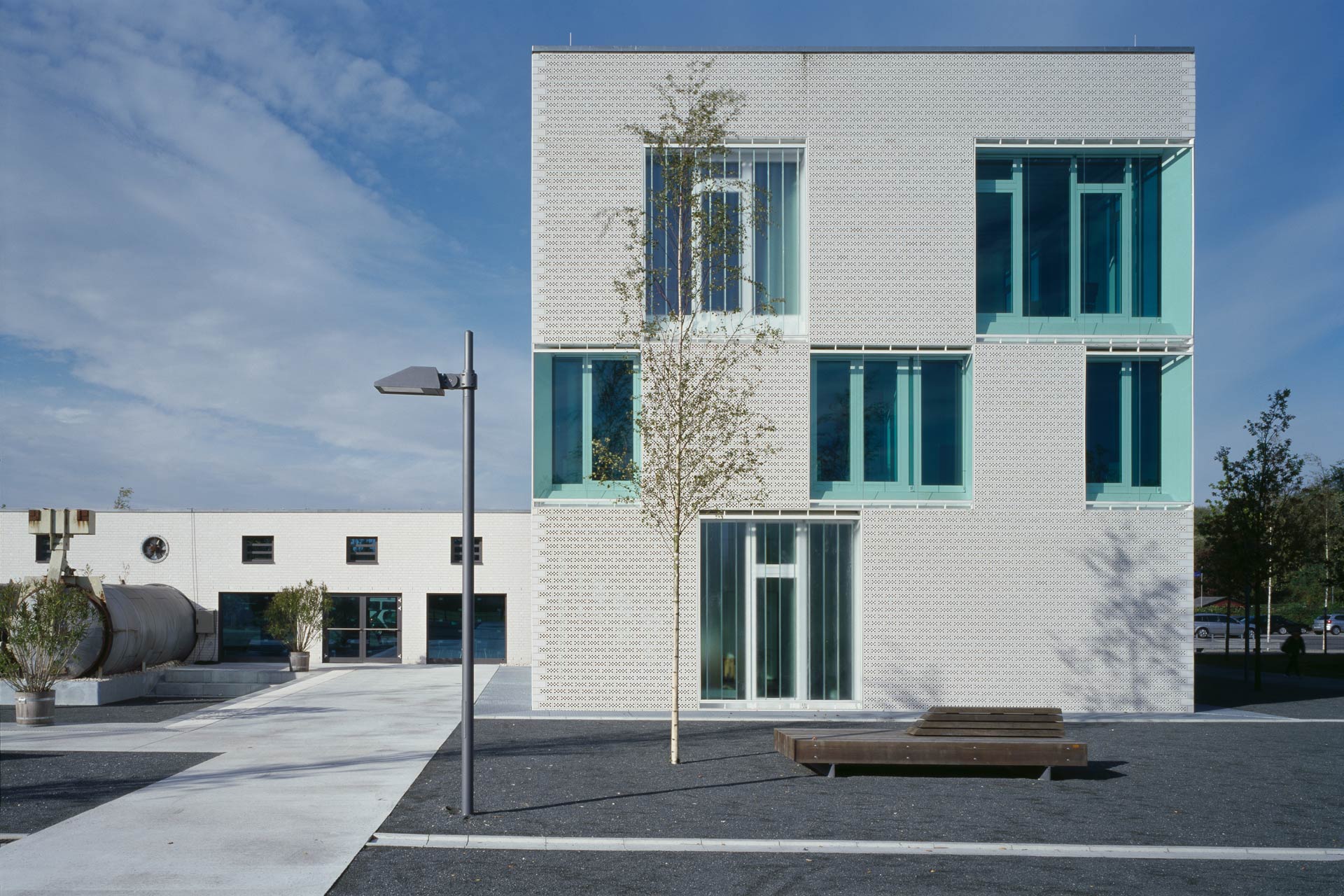 The double façade is separated by the floors as well as by the rooms. The inner shell is made of heat protection glass; horizontally rotated sand-lime bricks and single glass panes alternate in the visible facade with a sunshade arranged in the intermediate space. Due to the characteristic perforation of the sand-lime bricks and through air openings above and below the glass panes, a good ventilation of the gap is guaranteed. The perforation of the sand-lime bricks also creates interesting visual effects in the interior.