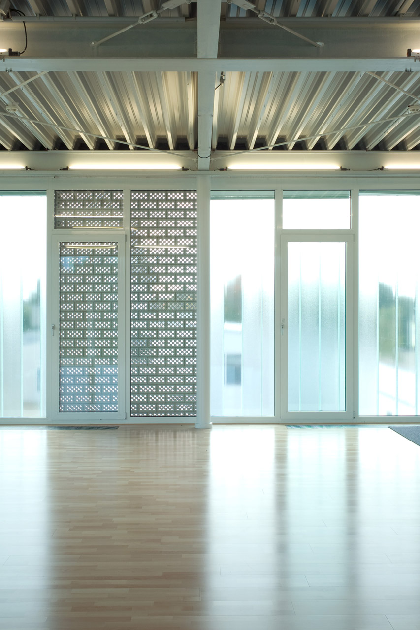 Adjacent to the converted factory building was a new building for the local music school with teaching and rehearsal rooms, a dance and movement room and a cafeteria in the foyer. All teaching and rehearsal rooms of the new building are naturally ventilated. The ventilation through the windows is supported by exhaust air openings in the raised attic area on the roof of the open staircase. Between the classrooms and the traffic areas there are soundproof overflow openings. Only the rooms for band practice in the basement are mechanically ventilated with decentralized ventilation units with heat recovery. Natural night air cooling removes thermal loads from the building and ensures that the rooms do not overheat in summer.