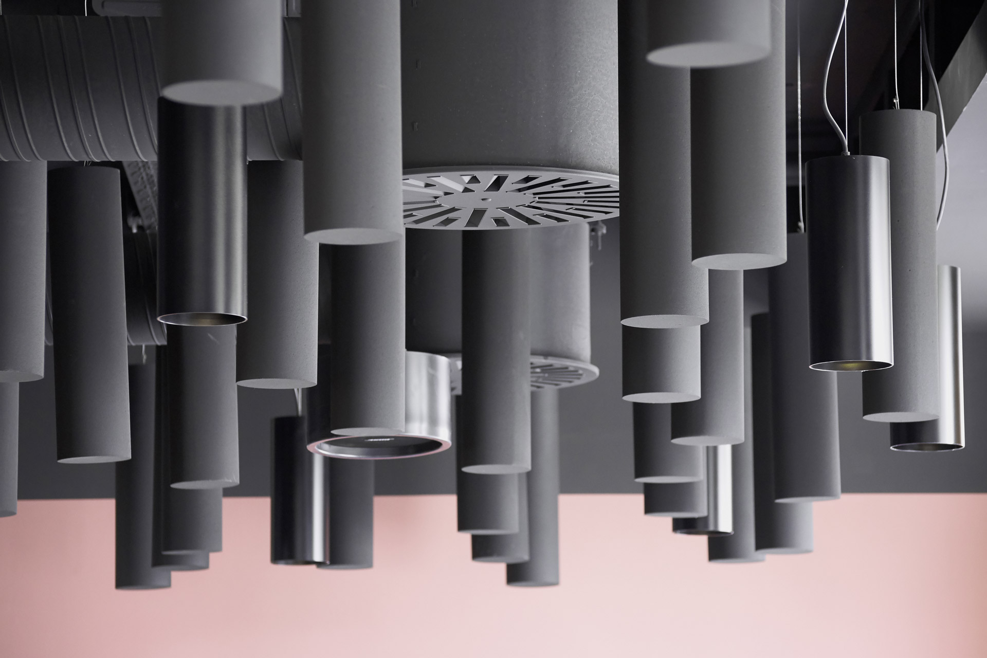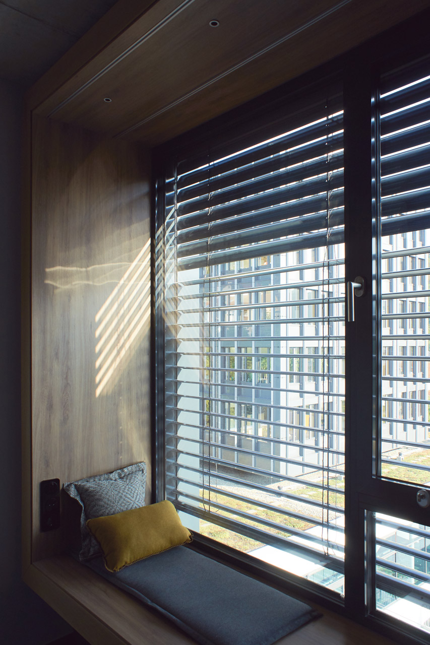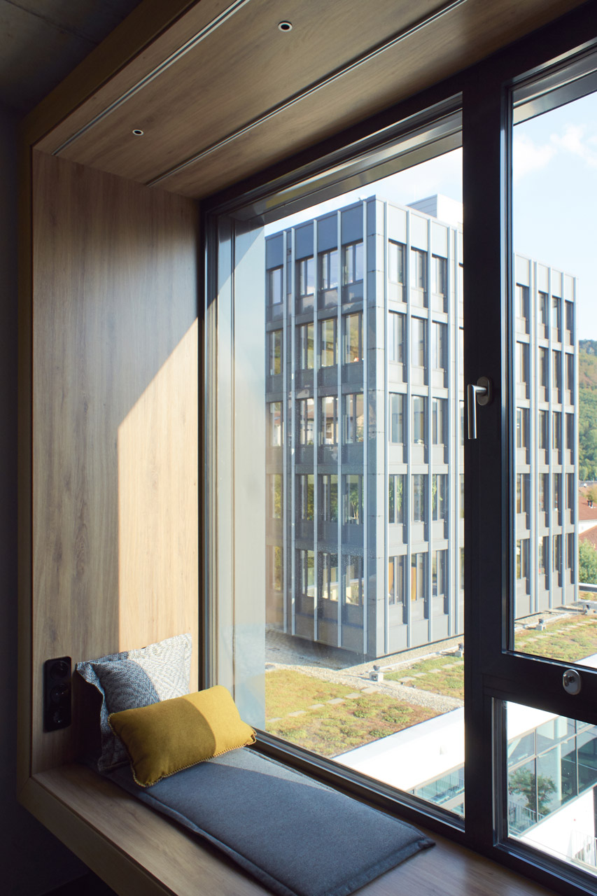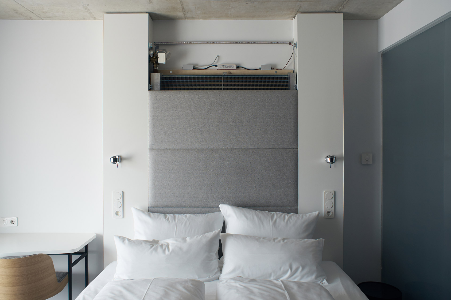 The new replacement building of the hotel, located right next to the town hall, offers 72 rooms, two suites, as well as spa, restaurant and underground parking facilities to guests from all around the world. Quality and guest comfort levels were the highest priority – realized through a simple, sleak and cost-effective concept which combines sustainable construction with low use of locally sourced energy. In coordinatiion with the design team, Transsolar developed the concept for energy, climate, and ventilation. Thermal comfort and daylight supply are guaranteed, and energy use is as low as possible, both developed via detailed simulations. Decentralized bathroom exhaust fans povide basic ventilation, drawing in fresh air via a passive downstream element in the facade. Moreover, guests may open windows for addtional ventialion. Ventilation through the windows combined with the thermal storage capacity of the exposed concrete ceilings allows for passive cooling of the hotel rooms during the transitional seasons. An external, movable sunshade regulates solar heat input and prevents overheating of the rooms. During the summer, a Gravivent System actively cools the rooms without a fan and almost silently according to the principles of gravity: warm air rises; at the top of the room it enters the system through a grid and cools down at the heat exchangers. The now cooler, heavier air falls down through a shaft and returns to the ground through air outlets in the room. Heating is provided by individually controllable convectors in the facade. They pre-heat the incoming outside air and heat the room together with the Gravivent System as this is also connected to the heating network. Utilizing the Gravivent System is unique for hotels in Germany. The energy system of the building is designed for low temperatures (95/82.4 °F) for efficient heat generation. It uses a bivalent-operated brine-to-water heat pump, which is coupled to the probes of a geothermal system. The peak heating load and domestic hot water preparation are provided by a CHP and a gas peak boiler of the neighboring town hall.