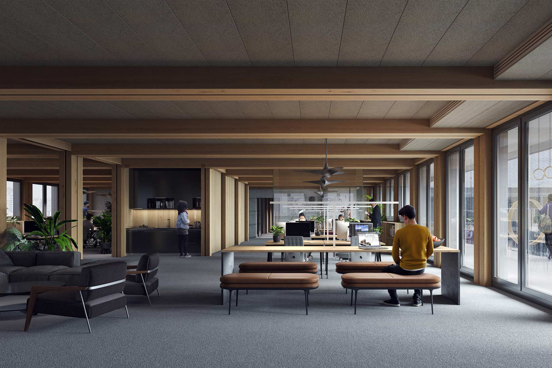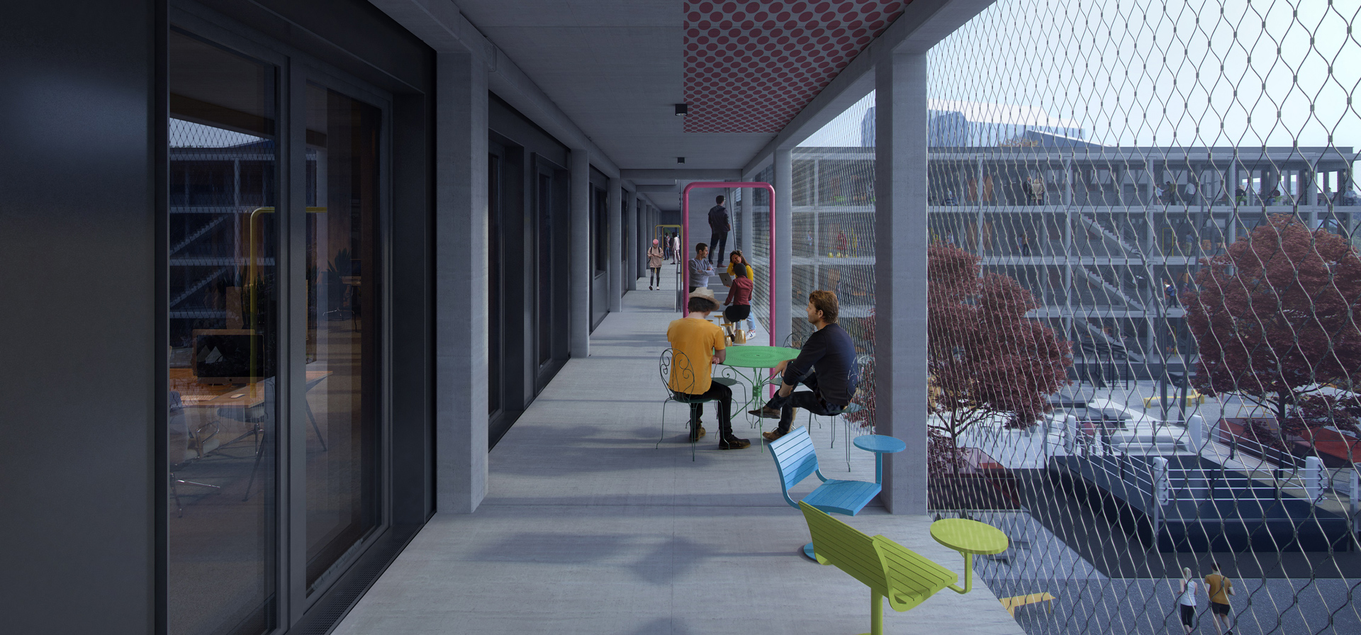 Also for fire protection reasons, the four upper floors of "Wood" are connected to each other via external pergolas, thus allowing interdisciplinary work across the floors.