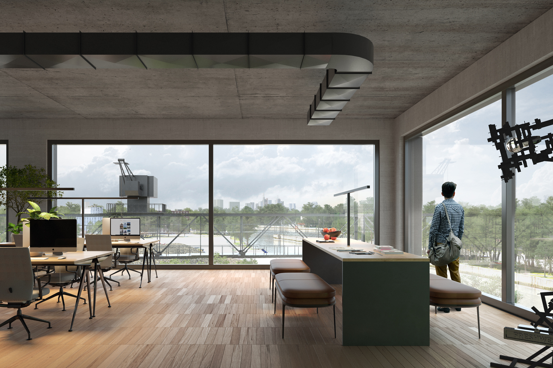 For "Wood" a decentralized ventilation concept was developed which supports the modular construction approach with the help of decentralized facade ventilation elements integrated into the hollow floor. Symbiotically, the ventilation system also serves for heating and cooling.