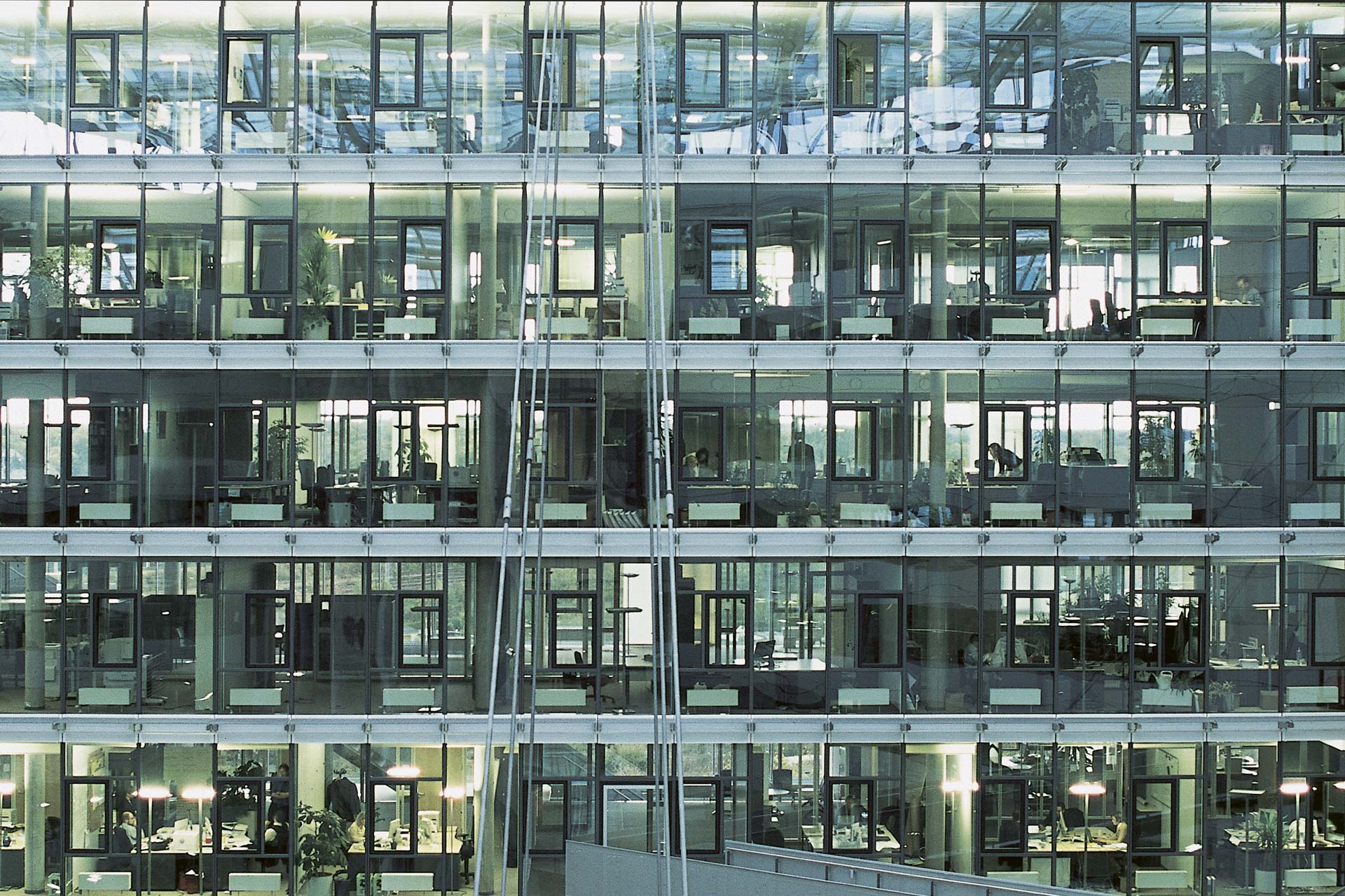 Together with the architects, HVAC and structural designers, Transsolar has developed the desired energy-optimized and naturally ventilated concept for the administration building from competition through building completion. The eleven-story building on a triangular plot has the shape of a prism: Two massive and one double-glazed office wing enclose a central atrium. It meets the German low energy standard , is comfortable for the users and ecologically designed. The ventilation concept primarily uses natural ventilation and night ventilation. Essential for this are the atrium and double façade with the possibility to reverse the direction of airflow to allow summer or winter operation. In winter, the supply air enters the double façade from the outside, flows through the rooms and passes through tubes in the concrete ceiling as exhaust air into the atrium. The driving force behind this is the natural chimney effect in the atrium. In summer, the air from the shaded, cooler atrium is channeled into the offices and vented through the warmer double façade. For this purpose, the atrium is supplied mechanically with air through a tempering earth channel. This creates a slight overpressure and ensures supported by the chimney effect in the double façade for d-aeration. In addition, the building is "flushed" and cooled during summer nights with cool nighttime air using the chimney effect the atrium with cool night air. Transsolar has performed numerous thermal and hydraulic simulations, making additional comfort measurements in the segment mock-up, for implementing natural ventilation as much as possible. Transsolar also worked on daylight performance with computer simulations, analyzed a 1:100 scale physical mock-up to determine the distribution of light in the atrium under an artificial sky, designed the combined system of shading and light baffles on the glass roof and guided the distribution of workplaces throughout the office spaces.