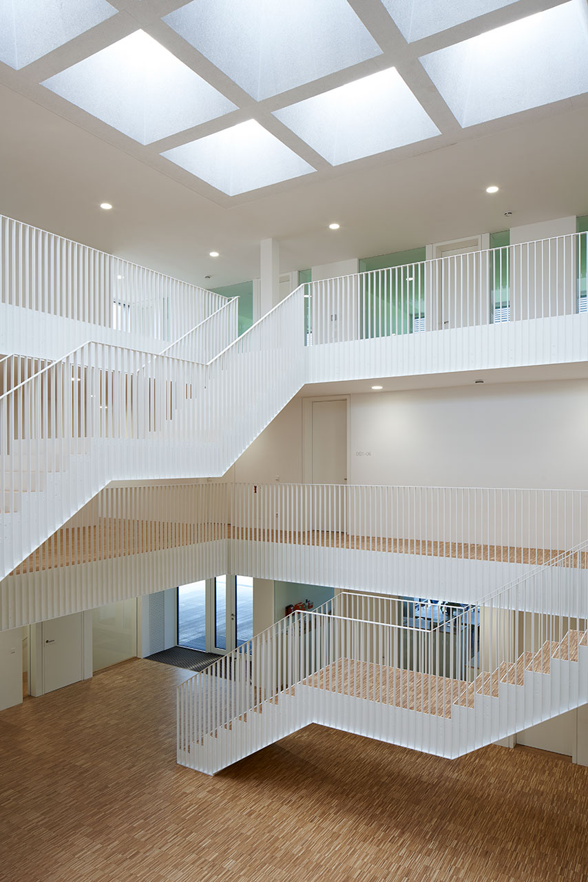These are laboratory rooms for the durability test, an employee cafeteria with a kitchenette on the ground floor, the office rooms and a seminar room. An open meeting area is located in the central atrium, which is flooded with skylights and extends over the first to third floors. The skylights also serve as smoke / heat exhaust and can also be used for normal ventilation of the atrium. The supply air then flows in from the ground floor through an electrically controlled lamella cassette.