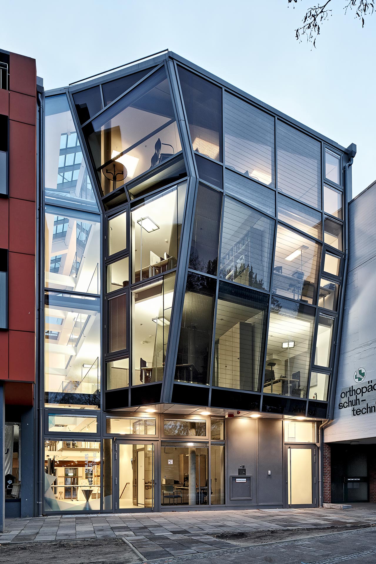 The urban situation of this small, 12 meter wide property enclosed by buildings on either side required a sophisticated daylight strategy. A vertical corridor between the new South façade and the old building maximizes daylight. It provides sufficient daylighting in the depth of the building complex and at the same time acts as a solar chimney to exhaust air. This allows for natural cross ventilation on all floors of the new and old building. The south facing façade is equipped with fixed micro-louvers integrated into the glazing, providing sufficient shading, while the angled south-west facing section requires retractable blinds; heat losses and solar gains were balanced through thermal modeling.