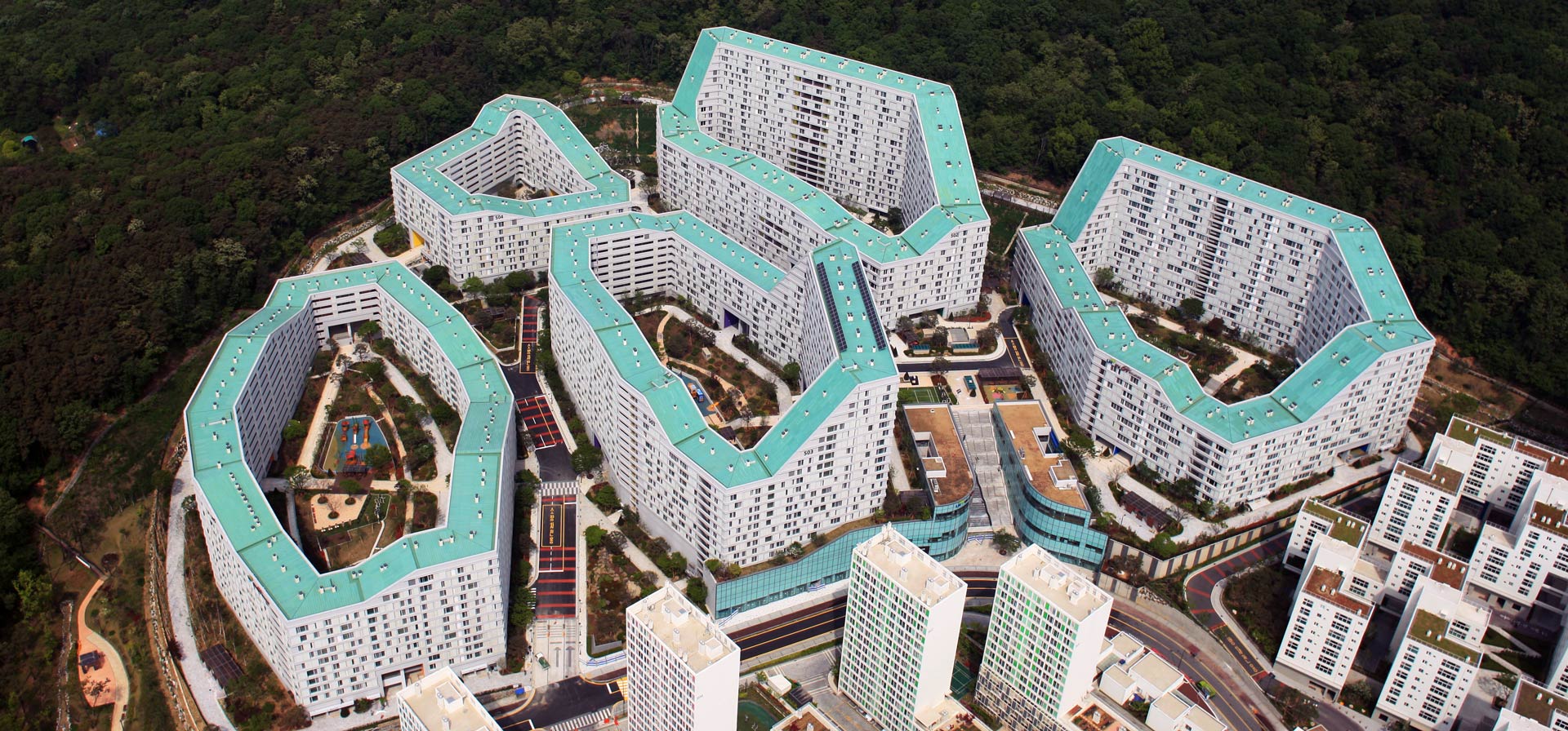 A residential area with close to 1400 apartments was realized in the hills south of Seoul. The client’s objective was to create affordable public housing for low income families with the focus on providing a new public housing prototype in Korea. The developed urban plan is based on the topography of the landscape of the site: within the sloping green hills lies an ensemble of urban blocks of different heights, public roads and landscaped outdoor spaces. The public green areas are inter-connected in a car free zone which enables an attractive living environment that stimulates informal encounters between residents. Each individual block also has its own courtyard that serves as a communal space with sport facilities, playgrounds and gardens.
