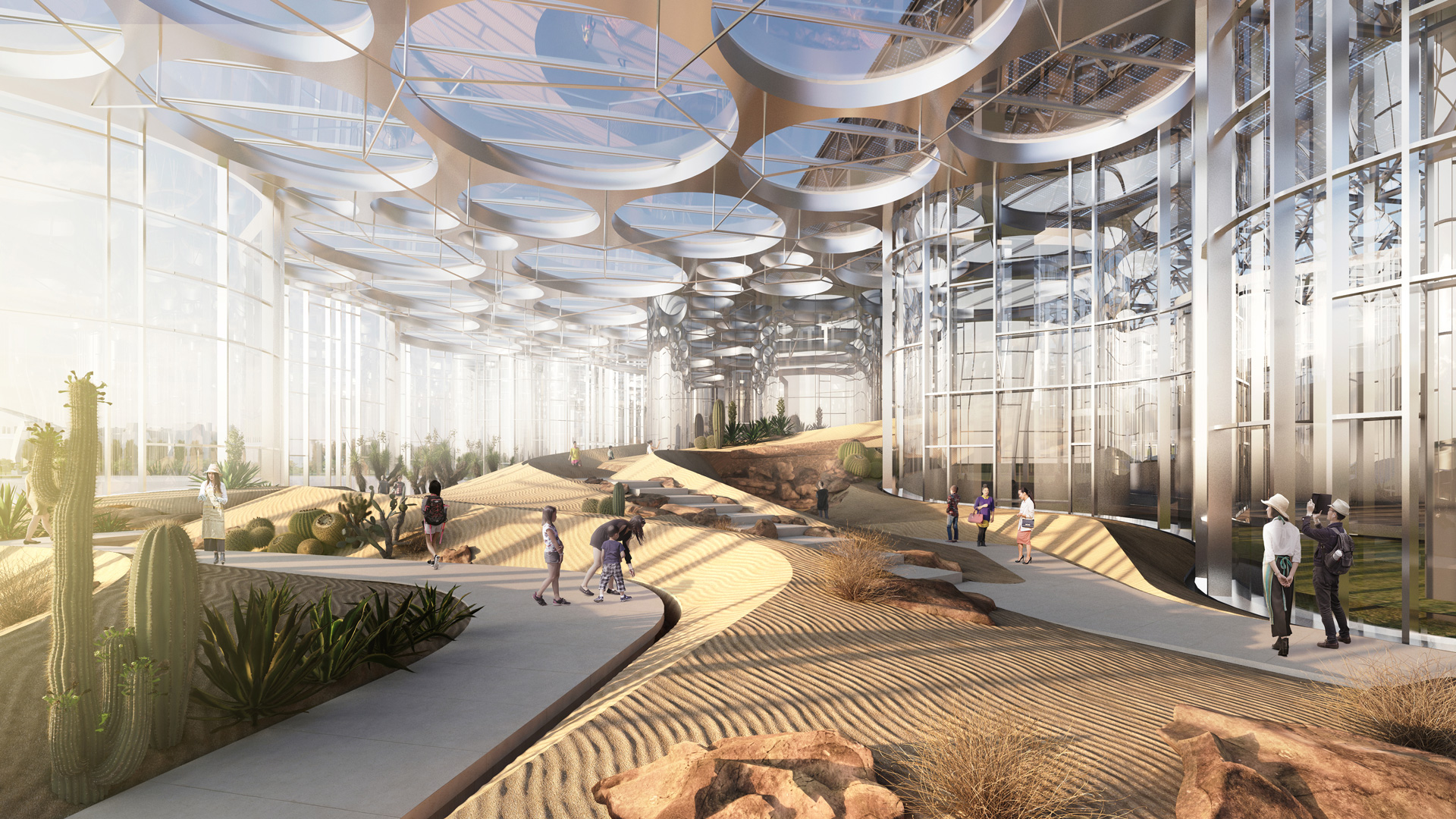 Double thermal glazing was envisioned to limit the enormous energy expenditure. Such glazing has the major disadvantage of losing a lot of irradiation, which might have to be compensated for with artificial light so the plants can thrive, as the intended plants are from climatic zones that offer a great deal of light: The greenhouses in this project are intended to house a desert, a tropical rainforest, and the Cloud Garden.