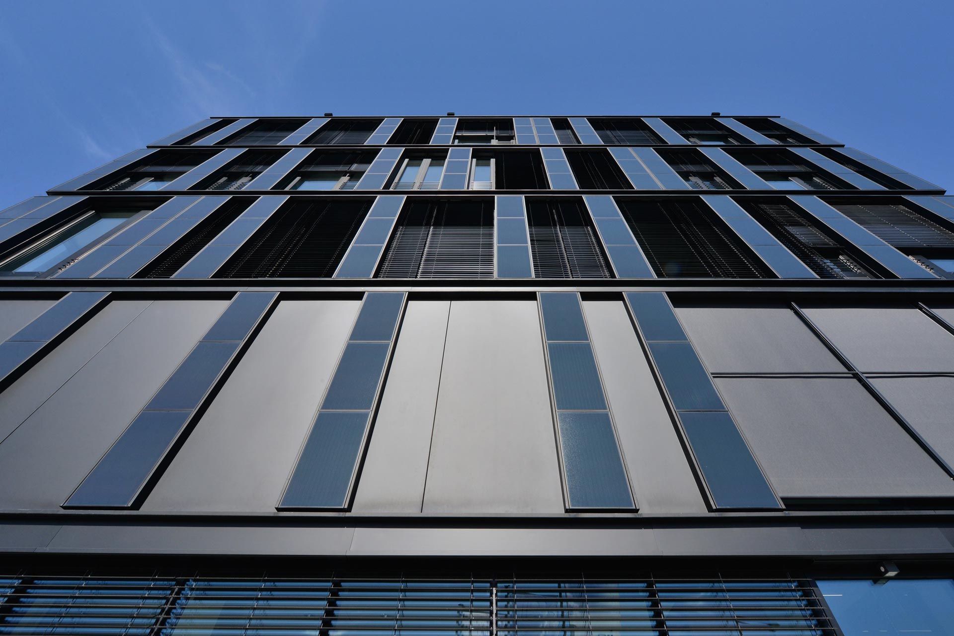 ZSW's new institute in Stuttgart's Engineering Park (STEP) is showing what is being researched here with its shell, as it is largely equipped with specially developed thin-film modules: The façade and its integrated PV elements with an area of around 170 m² / 1,800 sf² and a peak output of around 27 kW are black and form a homogeneous glass surface. The 230 modules integrated horizontally on the partially greened roof have an output of approx. 20 kW. A building equipped with vertically mounted modules on the façade can benefit from a low sun during the morning and evening hours as well as during winter. The façade is also designed so that modules can be easily replaced individually for test purposes.
