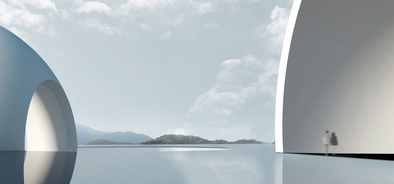 On a magnificent ocean view site 40 minutes from Taipei, the Necropolis of PaoSan requires a new arrival hall to serve the complex (with 10,000 existing burial sites) and a new pavilion for 150,000 additional ashbox sites. The arrival building will contain a 21 room hotel, a restaurant, a ceremonial chapel, an auditorium, and two small museums. The new pavilion will accommodate 1,000 people for ceremonial days, as well as 50 presiding Buddhist monks conducting ceremonies. There will be an adjoining amphitheater with seating for 5,000. All religions are respected and accommodated in this Necropolis. Steven Holl drew inspiration from the symbolism of the sphere in different religions and study of the intersection of circles as in the Borromei rings, which represent the karmic laws of the universe and the interconnectedness of life. Based on hand drawn watercolor series of intersecting circles the architect developed a concept of intersecting spheres. The final design incorporates white cement spheres at different heights which interest on a rectangular surface covered with a pool of water.